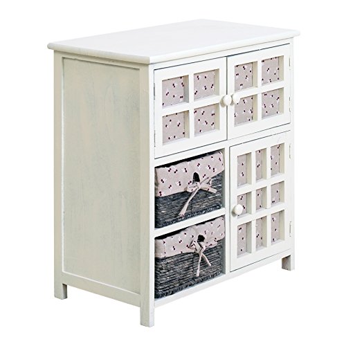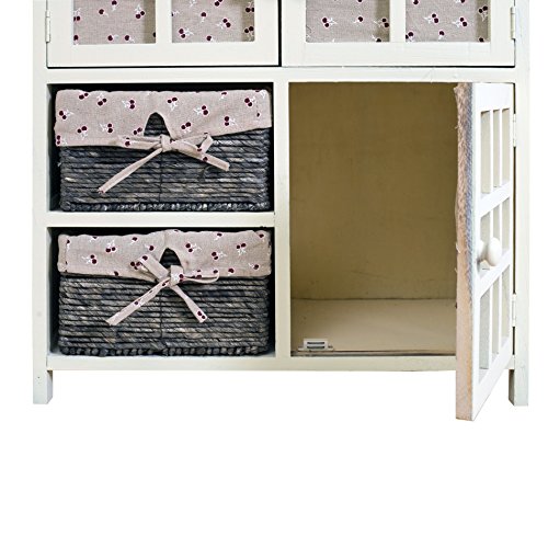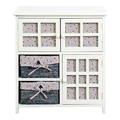 SPECIFICHE: Dimensioni: H 65 cm x L 60 cm x P 35 cm – Dimensioni Ante Superiori (2): H 21 cm x L 26 cm – Dimensioni Anta Inferiore (1): H 31 cm x L 26 cm – Misure cassetti vimini (2): H 14 cm x L 24,5 cm – Colore: Beige – Materiale: Legno Paulownia, MDF – Con Ripiani: no – Cod. RE4097