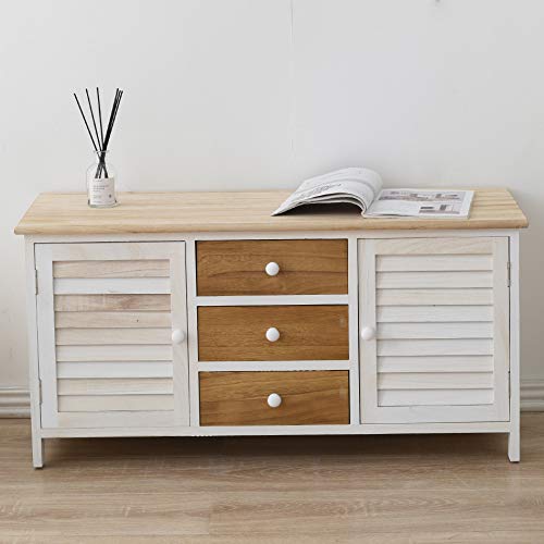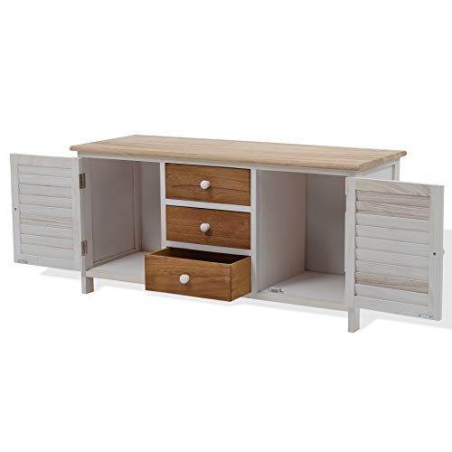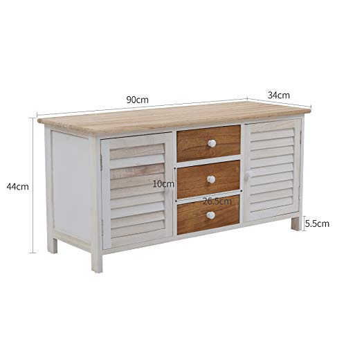 SPECIFICHE: Misure totali: h 44 cm x l 89,5 cm x p 34 cm – Misure cassetti (3): h 10 cm x l 26,5 cm x p 30 cm – Misure anta (2): h 36,3 cm x l 26,6 cm x p 1,6 cm – Colore panca: Bianco, Legno naturale – Cod. RE4184