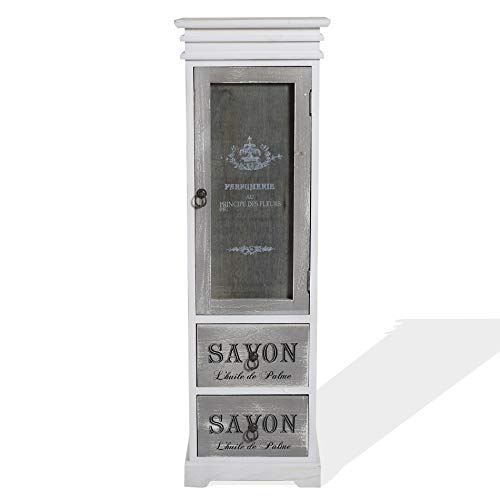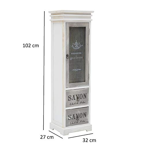 SPECIFICHE: Dimensioni: H 103 cm x L 32 cm x P 29 cm – Dimensioni cassetti (2): H 13,5 cm x L 25 cm x P 24,2 cm – Dimensioni anta (1): H 55 cm x L 25 cm – Ripiani: 2 – Colore: Bianco, Grigio, Beige – Materiale: Legno di paulownia, compensato – Cod. RE6092