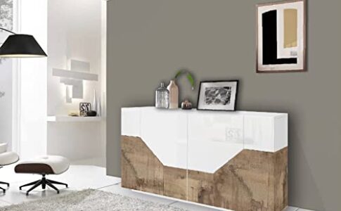 Dmora Credenza Moderna a 4 Ante Geometriche, Made in Italy, Madia da Cucina, Buffet di Design da Soggiorno, Cm 159x43h86, Bianco Lucido e Acero