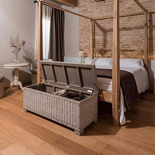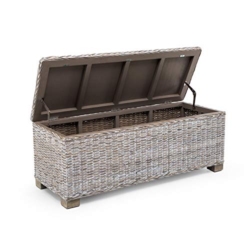 Cassapanca (panca con contenitore molto capiente) realizzata con solida struttura in legno e intreccio in rattan kubù naturale decapato bianco, stile shabby