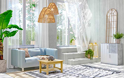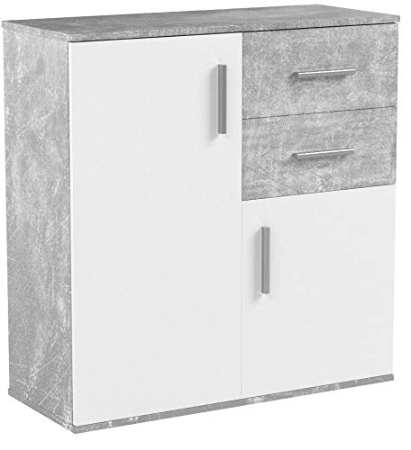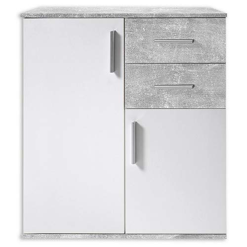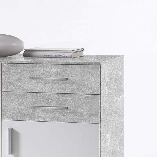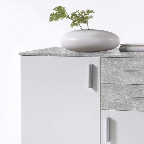 Comò versatile in bianco opaco e decorazione in cemento.