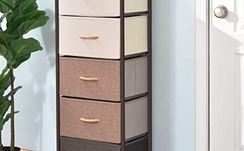 APEXCHASER Cassettiera con 5 cassetti in tessuto, sottile e salvaspazio, grande credenza con piano in legno, struttura in acciaio, maniglia facile da tirare per camera da letto, corridoio, marrone