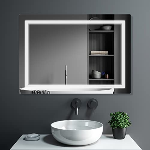 【Doppia luce / luce dimmerabile】 Mettiamo perle di luce doppia nella barra LED dello specchio, che è più luminosa della luce dello specchio ordinario e possiamo regolare la luminosità premendo il pulsante blu sullo specchio (0% – 100% regolabile)