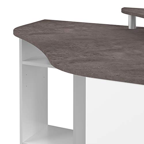 scrivania angolare con una pratica alzatina portaoggetti, e scaffali ripiani laterali