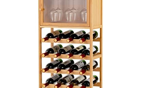 COSTWAY Portabottiglie in Bambù, Scaffale per 20 Bottiglie di Vino, con Supporto in Vetro e Ante Magnetiche Trasparenti, per Casa, Cucina, Dispensa, Cantina, Bar