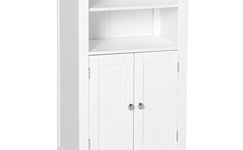 kleankin Mobile Bagno con Mensole Regolabili e Armadietto 2 Ante, Mobiletto Multiuso in Legno, Bianco, 50x30x93cm