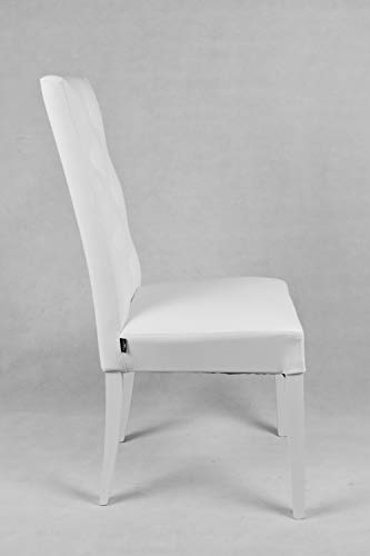 MATERIALE: struttura e gambe in legno di faggio, seduta e schienale imbottiti con poliuretano espanso e rivestiti in finta pelle DIMENSIONI: altezza totale 99 cm, larghezza totale della sedia 46 cm, profondità totale della sedia 55 cm, profondità della seduta 40 cm, altezza della seduta 46,50 cm. Dal momento che è un prodotto artigianale, le misure possono variare leggermente PORTATA: max 120 kg con peso uniformemente distribuito sul sedile