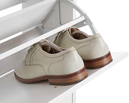 DIMENSIONI. Scarpiera: Larghezza totale 60 cm ~ Altezza totale 104 cm ~ Profonditá totale 24 cm. Interno di ciascun vano portascarpe: L 54 cm ~ A 9-10 cm. Interno del cassetto: L 51 cm ~ A 8,5 cm ~ P 18 cm. Altezza della mensola in vetro dal ripiano superiore: 11,5 cm. Appendiabiti: L 45 cm ~ A 100 cm ~ P 14 cm. Specchio: L 60 cm ~ A 30 cm ~ P 2 cm