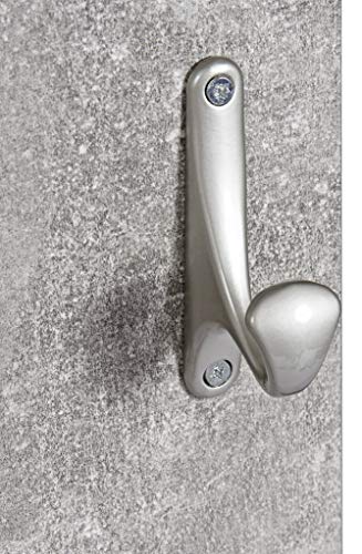 CARATTERISTICHE. Struttura in legno MDF con finitura color Grigio Cemento. Pannelli frontali della scarpiera color Bianco. Rivestimento in resina melamminica, facile da pulire e con elevata resistenza a striature o graffi. Due scomparti porta-scarpe, ciascuno dotato di sportello basculante ed un largo cassetto portaoggetti. Un ripiano superiore in vetro trasparente. Maniglie in metallo. Alloggio per circa 12 paia di scarpe. Appendiabiti pensile con 8 doppi ganci in metallo satinato e cappelliera