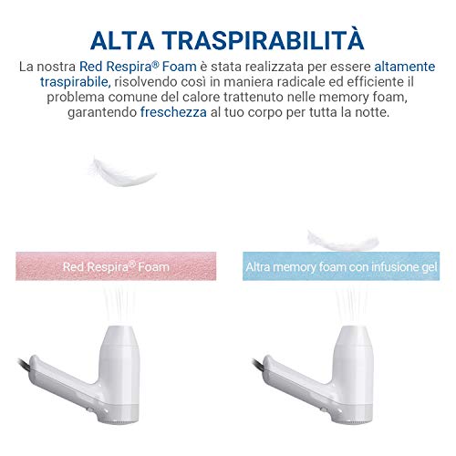 Altamente traspirante – lo strato Red Respira Foam, grazie alla sua particolare struttura ventilata, fornisce una ECCELLENTE AERODINAMICA in modo da essere il più traspirante possibile e controllare in maniera efficiente la temperatura del corpo per tutta la notte. A differenza delle altre memory foam sul mercato, non ti darà l’impressione di dormire in una palude. Si adatta ad ogni posizione del tuo corpo e ti garantisce la MASSIMA LIBERTA’ DI MOVIMENTO mentre dormi.