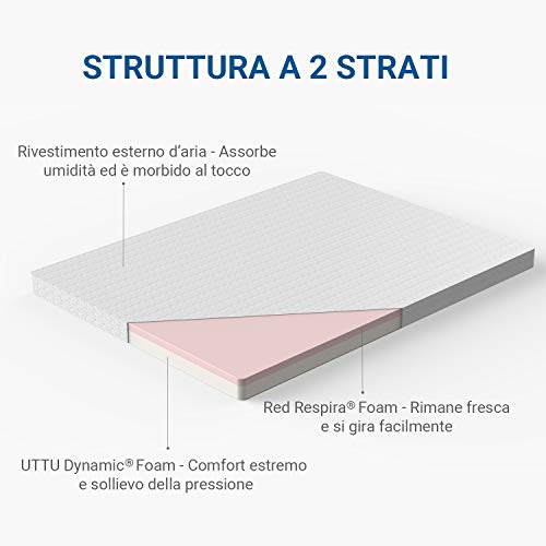 Prodotto a 2 strati – Il nostro correttore materasso è caratterizzato dalla presenza di ben 2 strati: il primo da 2 cm in Red Respira Foam e il secondo da 4 cm in UTTU Dynamic Foam. La combinazione dei due offre l’equilibrio perfetto tra MORBIDEZZA E SUPPORTO, in modo da essere estremamente comodi mentre la spina dorsale viene allineata nella corretta posizione, i punti di pressione vengono alleviati e la temperatura rimane fresca. Potrai perciò dormire AL MEGLIO notte dopo notte.