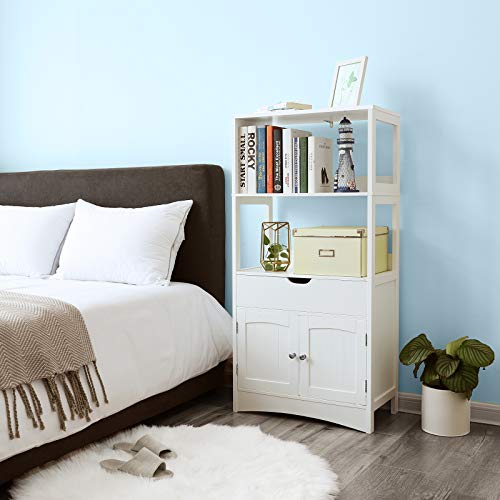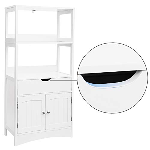 Capacità grande, in uno spazio compatto: 2 scomparti aperti per utensili da bagno per gli accessori da bagno più utilizzati, come la lozione per il corpo e rasoio; il cassetto e il vano dietro le due ante sono ideali per asciugamani, carta igienica ecc.