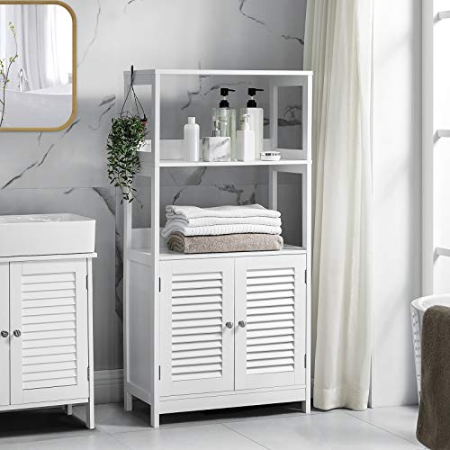 UN PEZZO CHIC: Tutti gli elementi del mobiletto si uniscono alla perfezione: la finitura bianca opaca, le ante a persiana eleganti e il profilo semplice; aggiungi un tocco fresco e rilassante ai momenti in ammollo nella vasca e alla routine di risveglio