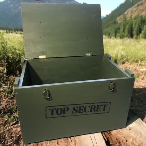 Look militare: come dal film scatola di legno, ottimo regalo per tutti gli appassionati militari. Baule con stampa decorativa Top Secret e Military Print.