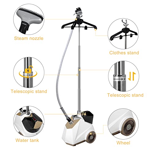 Stiratrice a vapore professionale ed efficiente: Il ferro a vapore verticale ha un’elevata potenza di 2200W e una costante emissione di vapore di 45g/min. Può riscaldare fino a circa 99°C in 45 secondi. L’apparecchio può disinfettare, rimuovere polvere e pieghe dai vestiti. È inoltre dotato di una manopola (4 modalità) per regolare la temperatura del vapore a seconda del tipo di tessuto