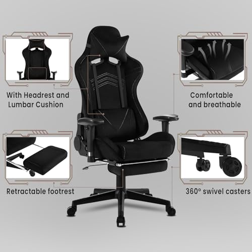 SEDIA GAMING ERGONOMICA: Con poggiatesta, cuscino lombare e sedile imbottito spesso, puoi giocare o lavorare comodamente per ore; con meccanismo basculante, schienale reclinabile e poggiapiedi estensibile, puoi rilassarti durante le tue pause