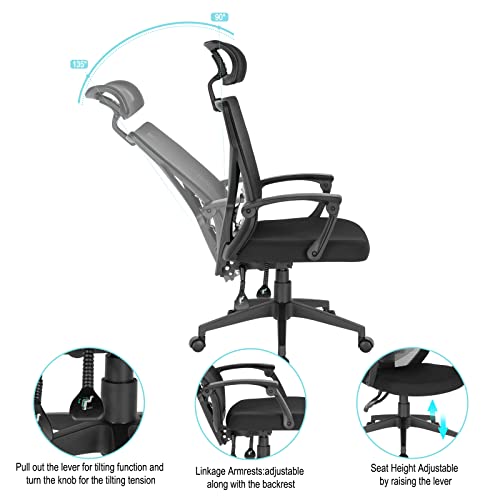 SEDIA COMODA E DUREVOLE: imbottita con spugna ad alta densità e rivestita in tessuto elastico e resistente all’usura, la sedia da scrivania con rotelle è morbida e offre un’esperienza di seduta ottimale. Il sedile e lo schienale in rete a maglia fitta migliorano la circolazione dell’aria. Lo schienale con i braccioli incorporati può essere inclinato fino a 135° per alleviare la pressione e ridurre l’affaticamento