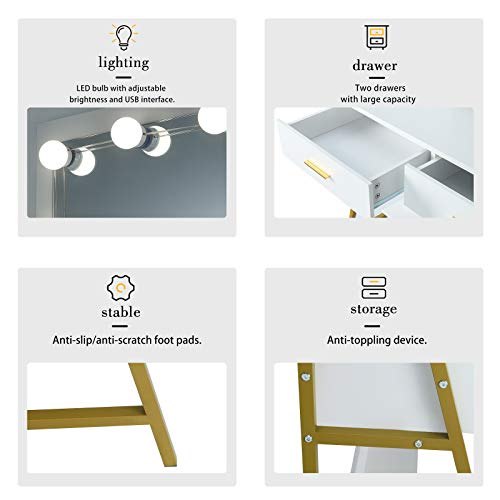 Specchio con luci LED: lo specchio di questo tavolo per cosmetici è nitido e chiaro ed è dotato di 10 lampadine LED, con la loro luce naturale e morbida ti forniranno una visuale luminosa della tua pelle, permettendoti di creare un make-up perfetto anche se la stanza non è ben illuminata. Le lampade a LED con interfaccia USB hanno le certificazioni CE e RoHS.