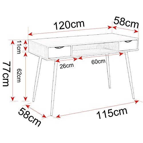 Dimensioni–Totale: 120 x 58 x 77 cm, cassetti: 26 x 58 x 11 cm, distanza per le gambe: 115 cm, carico del piano tavolo: 40 kg.