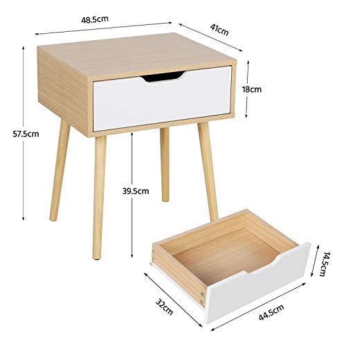 Venduto in un set di 2 comodini con cassetto da camera da letto. Robusta struttura realizzata da pannelli MDF P2 premium e gambe in legno massello. Questo comodino è in grado di contenere fino a 32 kg per il piano del tavolo e 5 kg per cassetto.