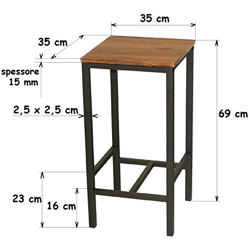 DIMENSIONI SGABELLI: Larghezza 35 cm – Profondità 35 cm – Altezza seduta 69 cm – Altezza poggiapiedi 16 e 23 cm – Peso 4 kg