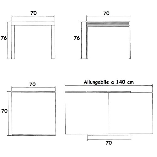 DIMENSIONI: Larghezza 70 cm – Profondità 70 cm – Allungabile a 140 cm – Altezza 76 cm – Peso 19 kg.